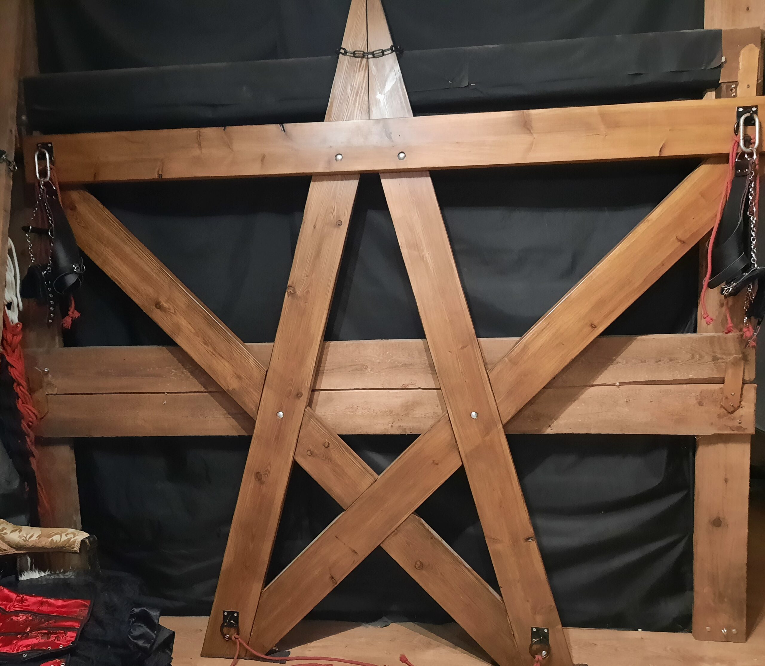 Our playroom as a stolid flogging pentagram, spanking bench suspension ring, electric toys, dildos, plut plugs and strap-ons, all here waiting